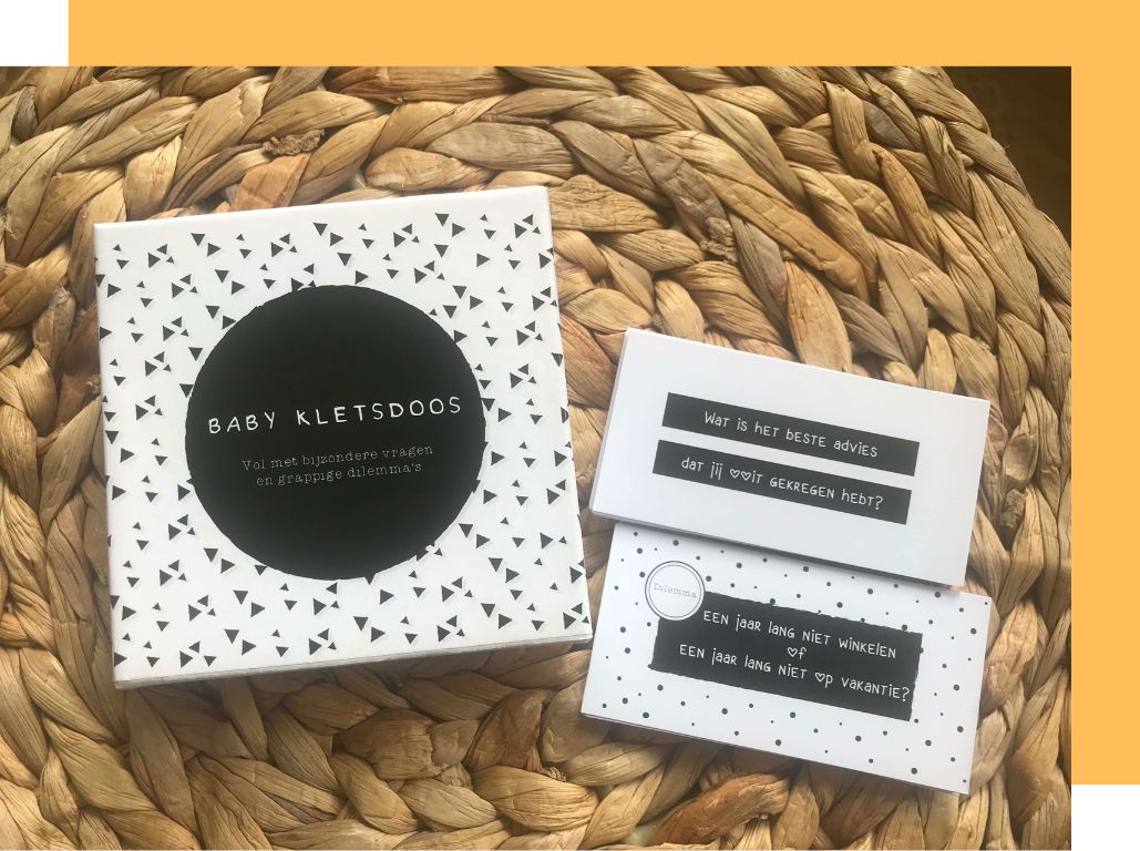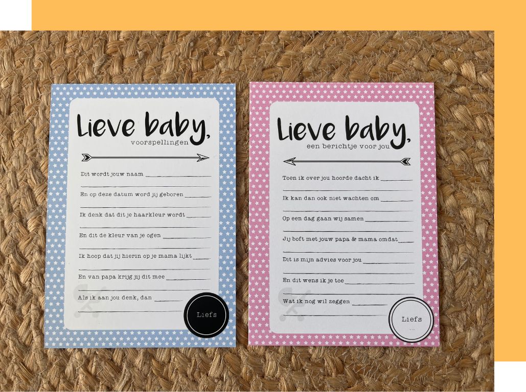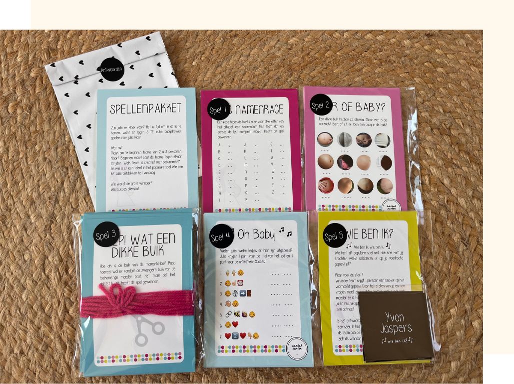 De producten uit de webshop van BabyshowerLatenOrganiseren worden in twee categorieën onderverdeeld: