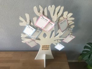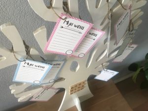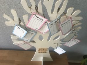 Deze houten wensboom mag toch niet ontbreken op een babyshower? Inclusief wenskaartjes om een leuke boodschap voor de toekomstige moeder en de baby op te schrijven. Kies zelf of je roze, blauwe of mintgroene wenskaartjes wilt voor in de wensboom.